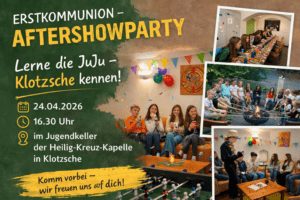 Gottesdienste Veranstaltung Vermeldung Jahresplan Wir sind auch hier zu finden: „Seid ein Segen und bereitet den Weg des Herrn!“ Erstkommunion-Aftershowparty am 24.04. ab 16:30 Uhr in Klotzsche Orgelpfeifen-Patenschaft Feiern der Erstkommunion am 12.04. & 19.04. Die Aufwerweckungskraft Gottes – FrauenLiturgie 17.4. RKWs 2026 – hier anmelden Königskinder auch 2026 wieder unterwegs Herr gib uns deinen Frieden! Kinder- & Jugendfußwallfahrt 2026 Ukraine-Hilfe Bibliolog – Termine für das Jahr 2026 Pflegeeltern gesucht Kirche Kunterbunt am 25.04.2026 in Pieschen Krabbelgruppe Kindergarten Klotzsche Faith and Food – Kochen.Essen.Reden.Glauben Familiengottesdienste in der Pfarrei